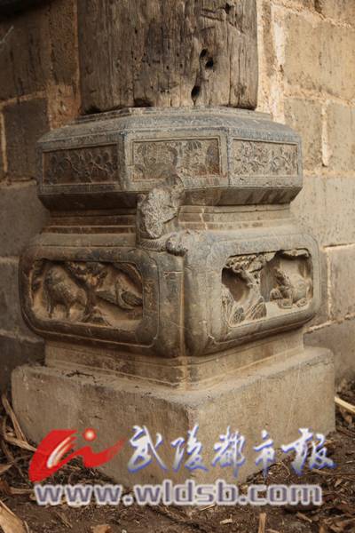记者看到,童家寨的朝门修得像亭子,支撑亭子的木柱均需要一人合抱,垫木柱下的石墩上雕有动物、花草图案,图案造型别致,工艺精湛。