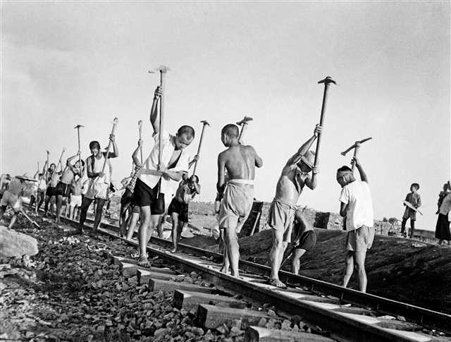 一九五零年六月十五日,成渝铁路开工修建,这是新中国成立后建成的第一条铁路,也是中国铁路史上第一条由中国人自己设计、施工,用自己生产的钢轨和枕木建设的铁路。图为工人们正在修筑成渝铁路。