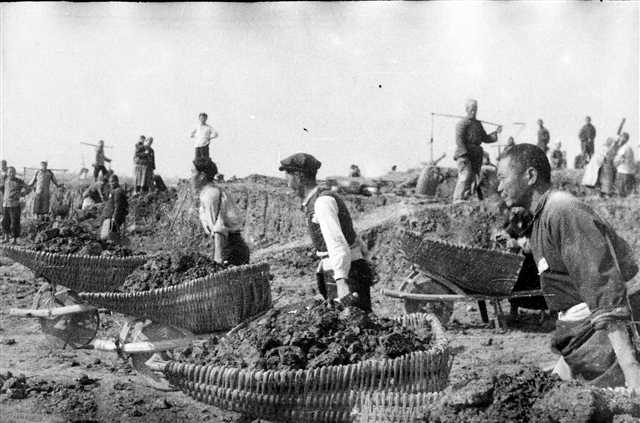 工人们肩挑背扛修筑新中国第一条铁路——成渝铁路。