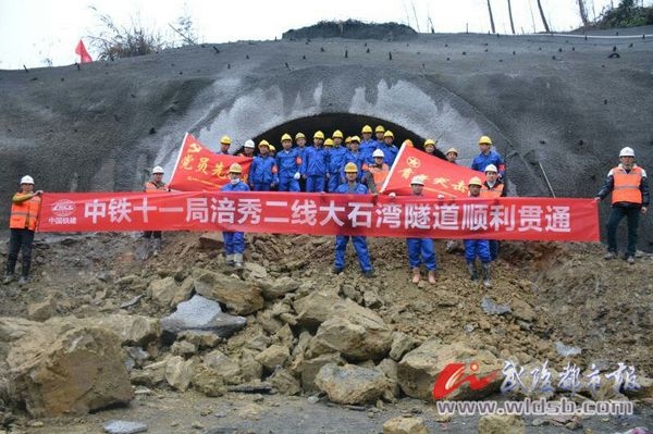 本报讯(通讯员 徐嵩 文/图)1月21日上午9时,经长达20个月的艰苦建设,黔江区铁路指挥部党员先锋队和青年突击队共同庆祝渝怀铁路二线黔江段大石湾隧道正式贯通,这也是渝怀铁路二线6标顺利贯通的第一座长隧道。大石湾隧道全长1060米,是渝怀铁路二线重点控制性工程之一。