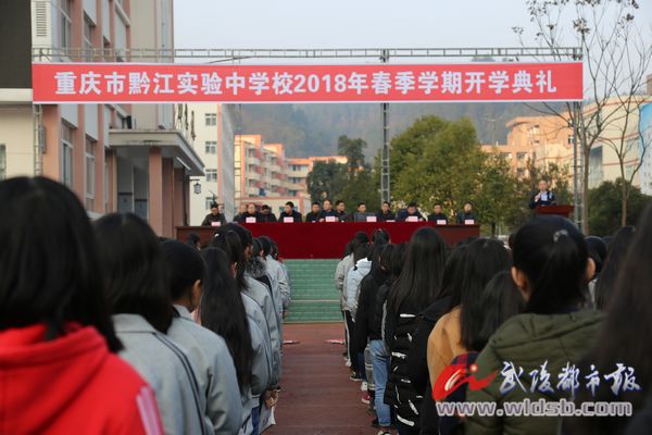 在庄严的国歌声中,五星红旗冉冉升起,开学典礼正式拉开帷幕。学校党支部书记胡岗总结了过去一年来学校教育、教学等方面取得的骄人成绩。他说,在新的一年里,全校师生在思想上要与区委、区政府提出的“打造武陵山教育高地”保持高度一致,充分认识到自己肩负的光荣使命和重大责任,凝心聚力、勇于担当、克难攻坚,努力推动学校发展再上新台阶。