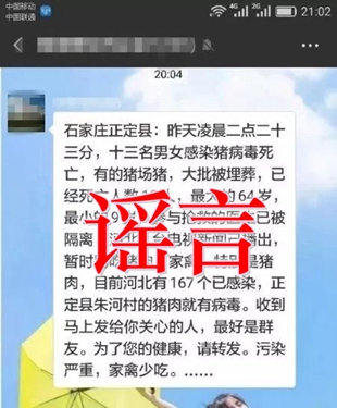 【谣言】石家庄正定县:昨天凌晨二点二十三分,十三名男女生感染猪病毒死亡,有的猪场猪,大批被埋葬,已经死亡人数13人,最大的67岁,最小的9岁,参与抢救的医生已被隔离,河北一台电视新闻己播出,暂时别吃猪肉、家禽,特别是猪肉,目前河北已有167个已感染,正定县朱河村的猪肉就有病毒,收到马上发给你关心的人,最好是群友。为了您的健康,请转发。污染严重,家禽少吃……
