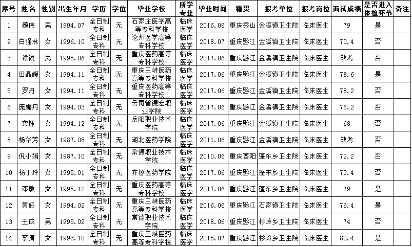 根据简章规定,现将黔江区2018年公开考核招聘属地化医学类专科生面试成绩及进入体检环节名单公布如下。请进入体检环节的考生,于2018年8月27日上午8:30前空腹携带本人身份证、一张一寸彩色免冠近照、500元体检费到黔江区老城人力社保局原办公楼院内(城西七路3号)集中等候参加统一体检。