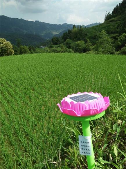 在水稻育苗期间,只要走进余和容家的田埂上,就能清晰地听到插在田埂上的太阳能光明机播放音乐的声音。这种音乐覆盖范围在一里地之内。