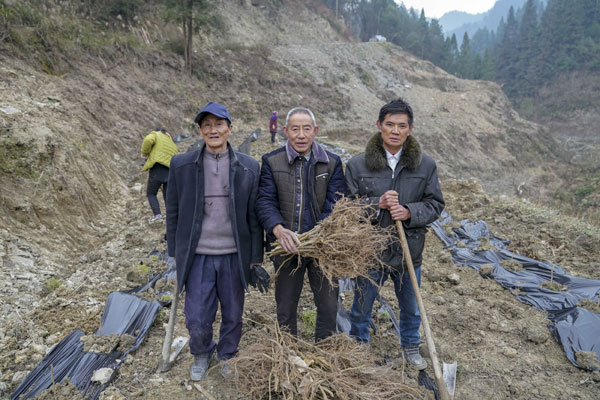 寒冬腊月,年味正浓。这本来是农闲时节,但半月谈记者在金溪镇长春村看到,20多个农民扛着锄头带着镐,栽桑覆膜,干得热火朝天。领头的腾树文、腾树长、陈正文年龄都已超过65岁,但他们和大伙儿一样挥汗如雨,硬是在平整出的陡坡地上栽下一株株桑树。