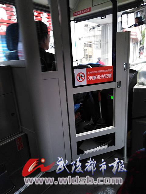 安全隔离门上张贴有警示标语:“影响公交车司机安全驾驶涉嫌违法犯罪”,既是提醒又是警示。