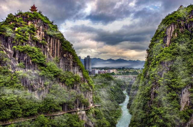 城中大峡谷自然地联通老城和新城,融合度高,气势宏大,总长超过30千米,横跨7个地质年代,基底既有震旦纪至白垩纪的沉淀,也有奥陶纪至第四纪的化石遗存,融山、洞、峡、瀑布、湿地、森林、地质奇观和佛教文化、土家风情于一体,是名副其实的“城即景、景即城”。