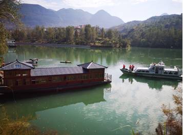 本报讯(通讯员 杨露 王敏 文/图)10月30日上午,神龟峡景区阿蓬江水面碧波荡漾,阿蓬江106、108、109号新旅游船在神龟峡景区新游客中心码头顺利下水调试。