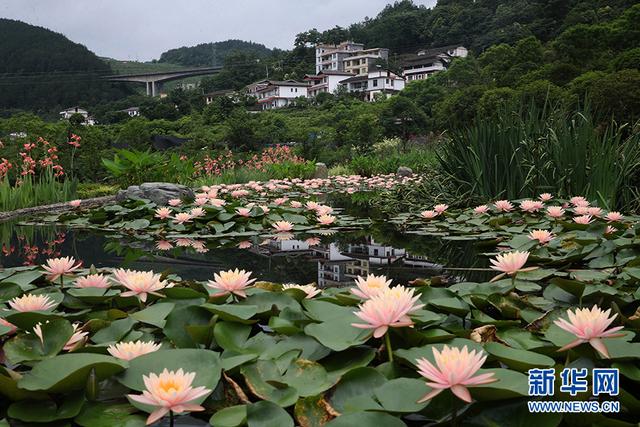 重庆市黔江区冯家街道寨子社区在创建重庆市乡村振兴重点示范村中,打造了以油牡丹、玫瑰、睡莲为主的花卉园。盛夏时节,盛开的睡莲把民居掩映成了一幅画卷。新华网发(杨敏 摄)