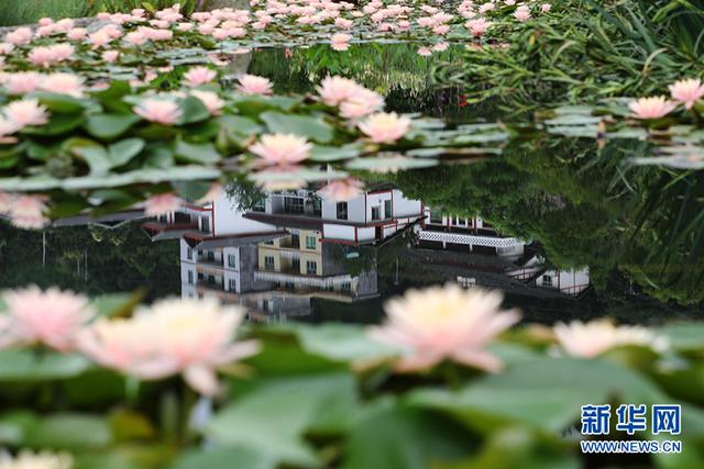民居倒影在睡莲池中。新华网发(杨敏 摄)
