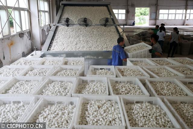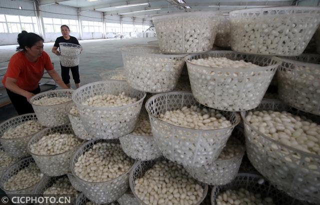 ↑2020年6月8日,重庆市黔江区一丝绸企业的工人在打理烘烤好的蚕茧。CICPHOTO/杨敏 摄