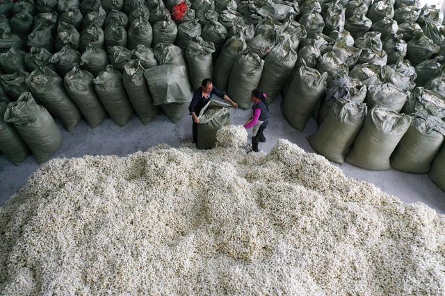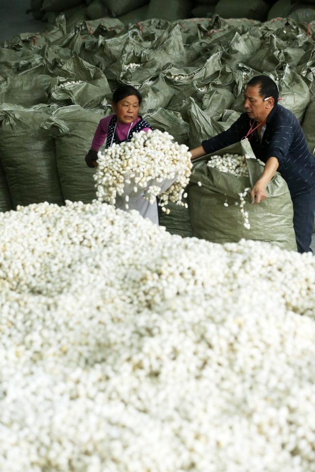 ↑10月31日,在重庆市黔江区双河丝绸厂,工人在整理蚕茧。重庆市黔江区有着悠久的种桑养蚕历史。近年来,当地将蚕桑作为农民增收的重要扶贫产业来发展,加快优质桑蚕基地建设,做大做强茧丝绸产业,采取“公司+基地+农户”的发展模式,让荒山披绿,群众增收。目前,桑蚕产业已成为黔江区农业的一张特色名片。新华社发(杨敏 摄)