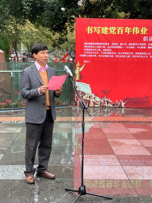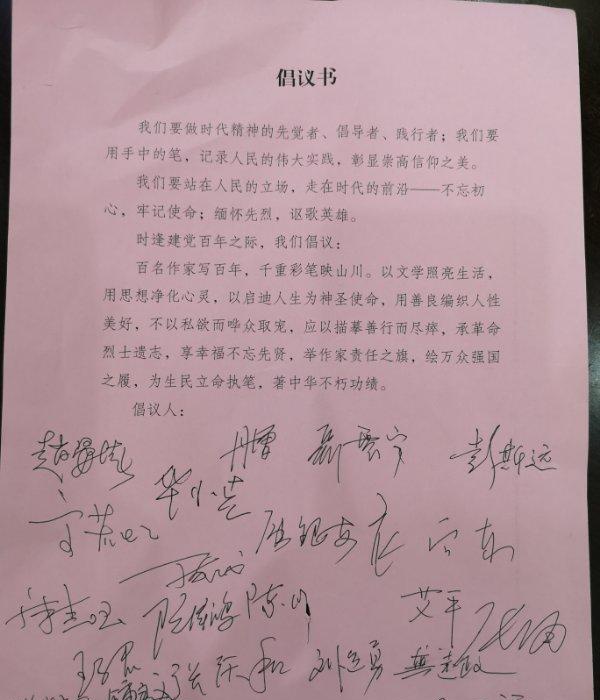 时逢建党百年之际,我们倡议:百名作家写百年,千重彩笔映山川。以文学照亮生活,用思想净化心灵,以启迪人生为神圣使命,用善良编织人性美好,不以私欲而哗众取宠,应以描摹善行而尽瘁,承革命烈士遗志,享幸福不忘先贤,举作家责任之旗,绘万众强国之履,为生民立命执笔,著中华不朽功绩。