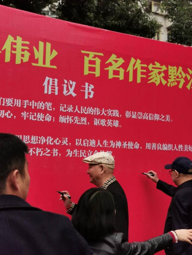 黔江区委领导及百位作家在红军广场共同举行"书写建党百年伟业,百名作家黔江倡议"签字仪式,倡导广大作家写出新时代民族奋进作品。