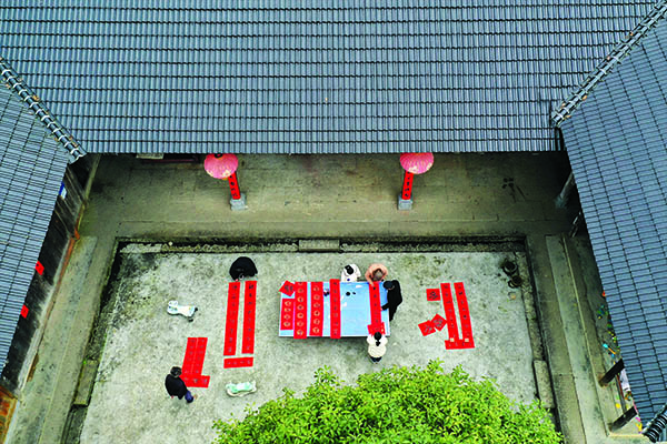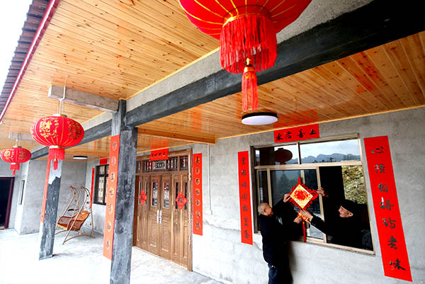在石家镇渗坝村是土家山寨,村民们打糍粑、推豆腐、贴春联、挂灯笼,忙得不亦乐乎。