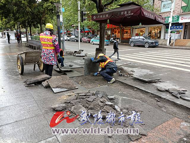 本报讯(记者 田丹 实习生 王彤 文/图)4月18日上午,记者在黔江区城东街道南海城商圈附近看到,工人师傅正抓抢晴好天气施工,一块块缺损的地砖被撬出来后,坑里倒上泥沙,再重新铺上了新的地砖,过往的市民纷纷对此点赞。