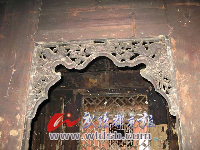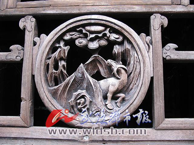 其三是雕工相对粗犷的门楼。门楼粗犷的工艺和装饰显现了土家族大户人家住宅气势宏伟的风格和面貌。正前方门额雕有18个戏剧人物,门额底内侧雕有两凤凰装饰,青瓦门顶,门两侧由石柱和夯土砌成,门柱刻花草纹、兽面纹、万字纹等。从雕刻技法上看,采用的有圆雕、镂雕、阴雕、线雕、浮雕等多种技法,这些均反映黔江工匠的高超雕刻技法和风格的多样性,亦可窥见黔江土家木工雕刻和石工雕刻文化的强大实力和风格面貌特色。