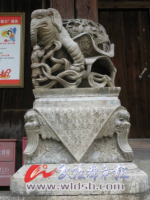 其一是步入张氏民居大门,前厅廊道外侧四个硕大的柱础跃入眼帘,给人以强烈的视觉冲击力,使人不得不为此艺术造型所震憾,不得不为此高超的工艺技巧所折服。其雕刻的内容看似一般题材,然仔细观赏,却给人高于一般的感觉。这主要源于匠人构思独特,想象丰富,布局得当,组合新颖,赋于了动植物以新的生命力,把普通的动植物变得不普通,能给人以无限的遐想和瑰丽新奇的印象,堪称鬼斧神工。四个柱础为一对雕刻的石狮(一雄一雌)与一对石雕白象(一雄一雌),规格为73cm×76cm×110cm,它们由黔江本土匠人卓国福、卓国友、卓国兴、卓国欢兄弟四人经六年雕刻而成,充分说明这四个石雕柱础工程之巨大,用工之浩繁,耗时之久,为卓氏兄弟石工雕刻的代表作。这四个柱础内涵丰富、艺术构思新颖、造型组合别致、工艺技术精深、布局设计合理、审美意识独到。雕刻除主要的狮象外,还雕有双龙戏珠、双牛性春、山羊上树、猴捅马蜂窝、野鹿衔香草、驯狮人、驯象人、麒麟、兽面纹、荷叶、牡丹折枝、水仙花、菊花、卷草、万字纹和杂宝纹等,蕴含着丰富的民俗文化和地域文化特点,折射出民族心理、社会道德、建筑理念和艺术追求的时代风貌,堪称我国石雕艺术的精品,把整个张氏民居建筑的艺术形象和文化内涵推向一个高潮。1988年,曾将张氏民居四个柱础石狮、石象照片送阿尔及利亚展出,受到好评。1993年,北京的有关专家在考察张氏民居柱础的石雕工艺之后,赞不绝口,认为具有较高的收藏价值、鉴赏价值和开发价值,可与北京故宫石雕艺术作品媲美。