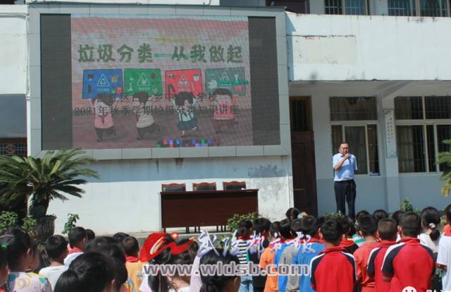 开学第一天,在白土乡中心小学校(如图)、南海中学等召开了全校学生大会,学校负责人为学生们详细介绍了垃圾分类的相关知识,什么是垃圾分类、生活垃圾的种类、垃圾不分类的危害和垃圾分类的好处等,带领大家认识了不同类型的垃圾桶和各类分类标识,引导同学们从思想上重视环境保护,从行动上积极参与垃圾分类,号召大家在日常生活中从自身做起,对垃圾进行分类,为保护环境贡献一份力量。