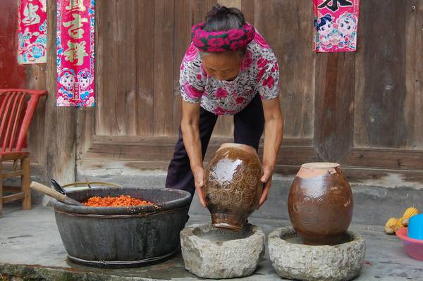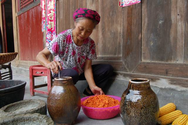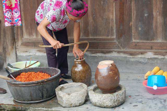 在白石镇中河社区,记者目睹当地老人,将做好的渣海椒装进坛内。老人告诉记者,在当地,渣海椒的传统制作方法,家家户户都会做。即用石磨将大米或玉米碾细、去糠,然后用刀剁成碎块的辣椒、生姜、大蒜,再添加花椒、八角茴、茴香等佐料混合在一起,用石磨碾成辣椒酱,放入食盐与米面或玉米面进行搅拌均匀,装进“倒扑坛”内。