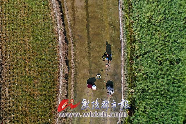 中塘镇胜利村村民在稻田里整理育秧农膜