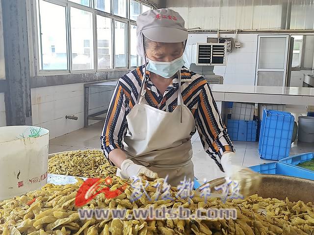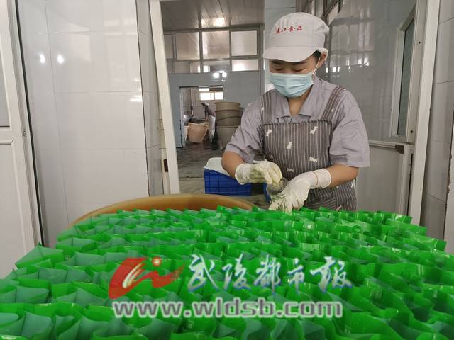 采访当天,蓬江食品有限公司厂房里,每一条生产线都是一片繁忙,刚刚进入生产车间,记者看到,工作台上堆满了泡椒和地牯牛,数十名工人分工明确井井有条地在忙着生产。