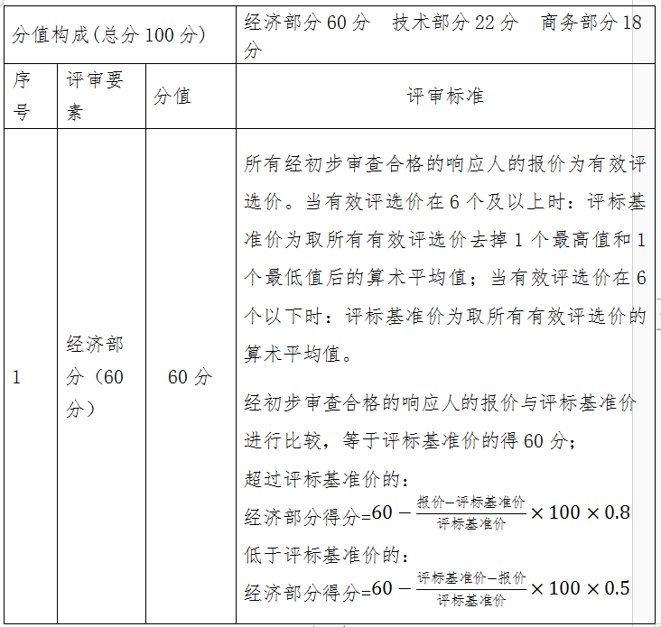 本次比选采取综合评分法。在经过初步审查后对符合本文件基本要求的比选响应人进行详细评审,总得分为经济、技术、商务三种评定因素分别按照相应分值计算分项得分后相加,满分为100分,比选响应人得分最高的作为成交候选人。评分办法如下: