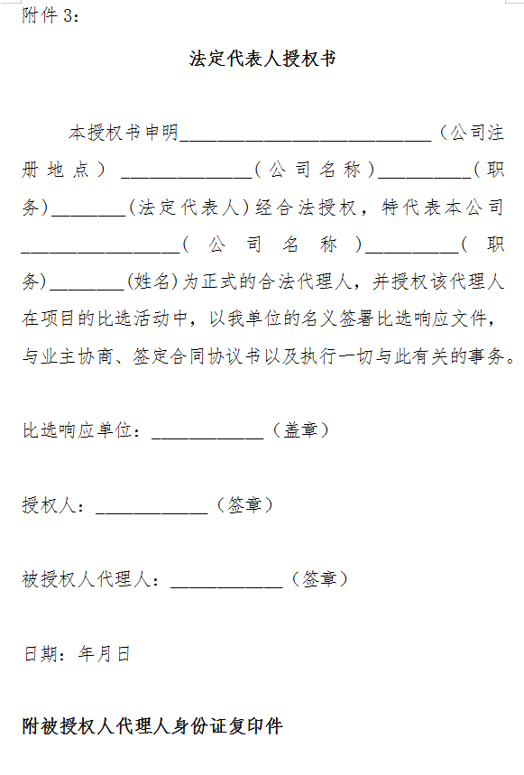 5.5 比选会各比选响应人须至现场参加。参加比选会的比选响应人的法定代表人或其授权的代理人应当随身携带本人身份证(原件),授权的代理人还应当随身携带法定代表人授权委托书(原件),以备核验其合法身份。