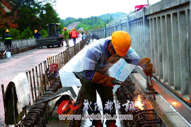 5月1日,中铁八局工人在渝湘高铁重庆黔江段葡萄沟大桥上施工