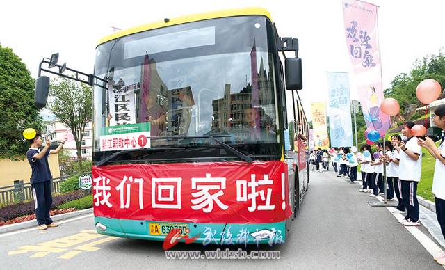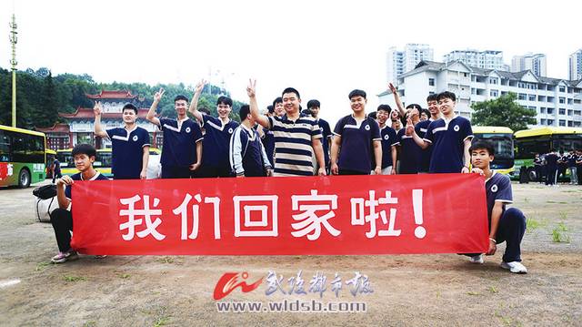 现场,大幅标语“我们回家啦”格外醒目,两个学生用双手将横幅拉得横平竖直,一大群学生比划着手势,嘴里喊着“耶”!脸上灿烂的笑容瞬间定格,留下人生中最珍贵的回忆。