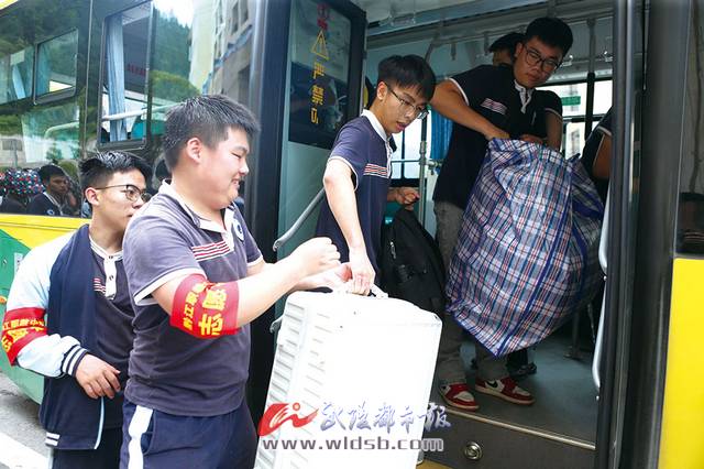 校区里还有戴着红袖章的志愿者,他们双眼盯着大客车。车门打开,志愿者们快步来到车门前,双手接过从车上递出的行李箱,穿梭于宿舍楼的各个寝室之间,把书籍、棉被、衣服等一同搬进寝室。搬家队伍其乐融融,齐心协力共同迎接美好新生活。