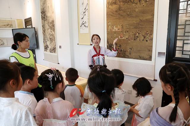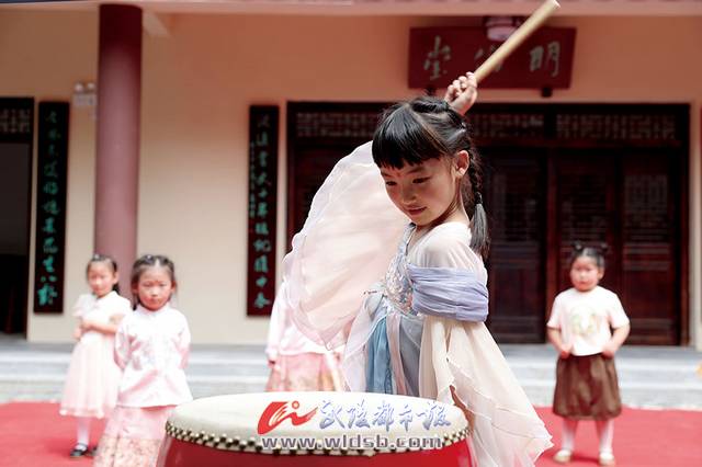 活动现场,小朋友们身着汉服,通过端正衣冠、祭拜孔子、朱砂启智、击鼓明志、蟾宫折桂、参观书画展、体验制作非遗手工水拓画等形式,感受中华优秀传统文化魅力,提升少年儿童的民族文化素养,弘扬和传承中华优秀传统文化。( 首席记者 杨敏 摄)