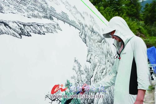 位于两细路细水村路段,墙绘设计师及创作团队正对新设计的墙绘进行上色,一幅百米画卷,串联起了“中国峡谷城·武陵会客厅”的“峡、江、山、水、城”,黔江“幽、险、清、奇、美”的诗意山水跃然墙上。