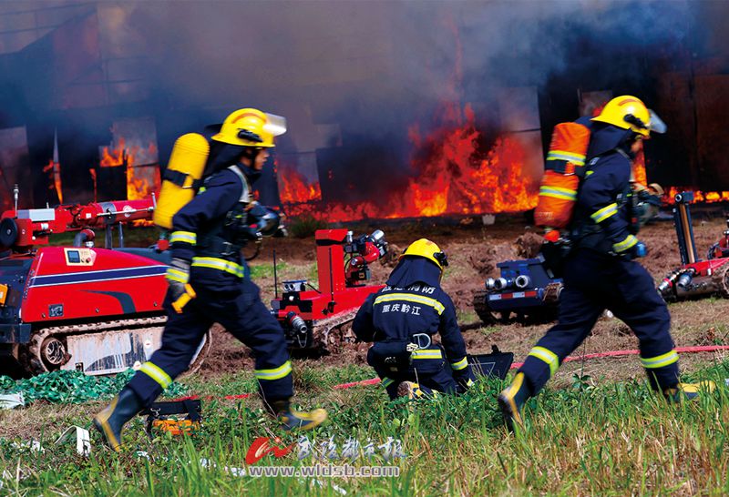 无人机和灭火机器人在“燃气火灾现场”灭火