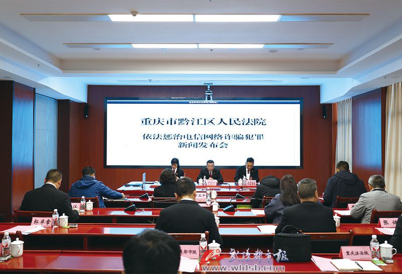 本报讯(记者 刘旭东 文/图)为回应社会关切,彰显打击治理电信网络诈骗犯罪的坚定决心,11月29日,黔江区人民法院举行依法惩治电信网络诈骗犯罪新闻发布会。市四中法院审判委员会专职委员张泽端到会指导。区人民法院党组成员、政治部主任徐曼主持新闻发布会,党组成员、副院长王勐视通报了黔江区人民法院2021年以来审理电信网络诈骗犯罪案件情况,刑庭庭长郎卓章通报了三起电信网络诈骗典型案例。发布会特别邀请了市人大代表、区政协委员出席。