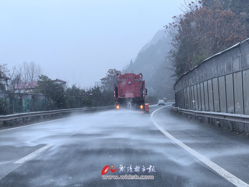 本报讯(通讯员 聂小林 姚焘 文/图)1月7日,G65包茂高速重庆段最高点K1900+650M(酉阳境内)迎来2025年的第一场雪。根据气象预测,最近5日渝东南区县迎来大幅降温,其中黔江、酉阳、秀山最低气温降至0℃以下,最低达-4℃并伴随雨夹雪,给高海拔地区的高速公路运行安全带来严峻考验。重庆交通执法总队高速公路第三支队提前采取应对措施,全力保障辖区高速公路畅通安全。