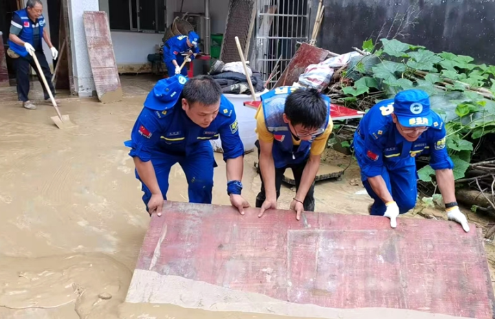 张岚翔(左一)与队友清理淤泥(资料图片)