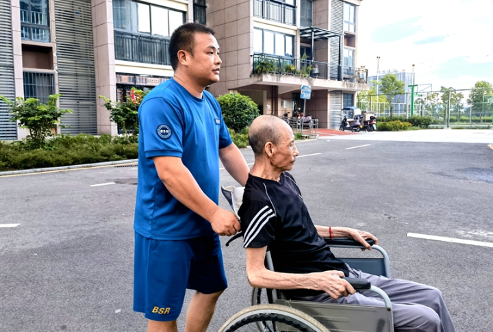 张岚翔推着父亲在小区散步