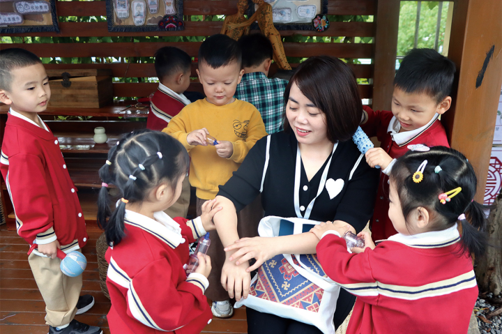 参会嘉宾在幼儿园体验中医项目