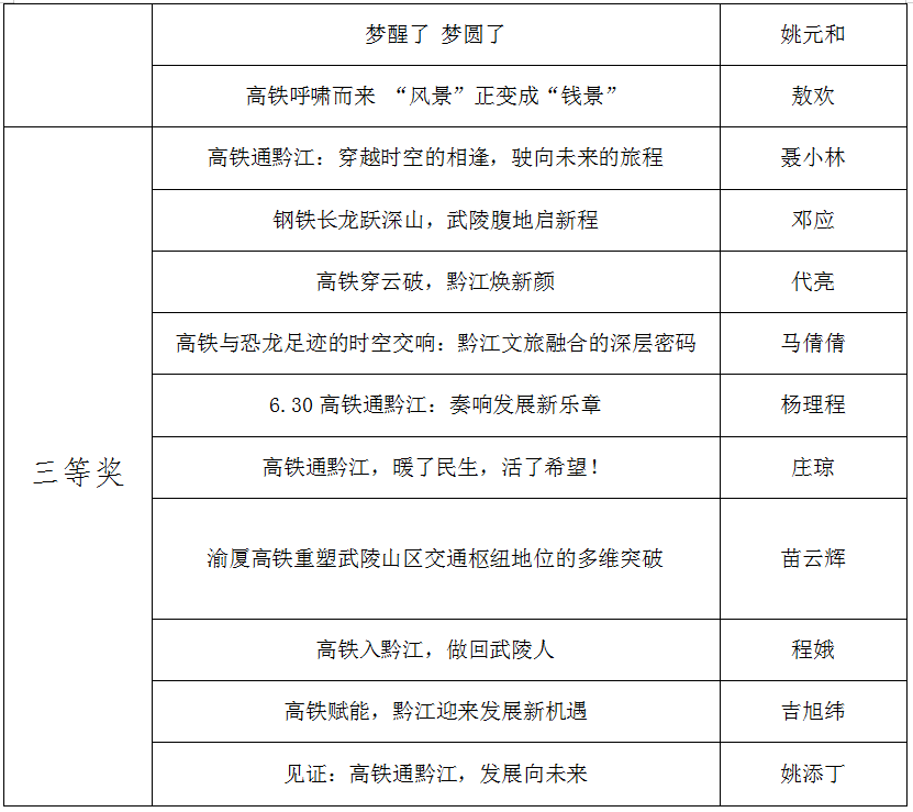 “我看6.30 高铁通黔江”主题征文活动自启动以来,得到了社会各界的广泛关注与积极参与。经综合网络传播数据和专家评审意见,评选出优秀网评、优秀小故事一、二、三等奖各3名、5名、10名,优秀文案奖及参与奖若干,现将获奖名单公布如下。