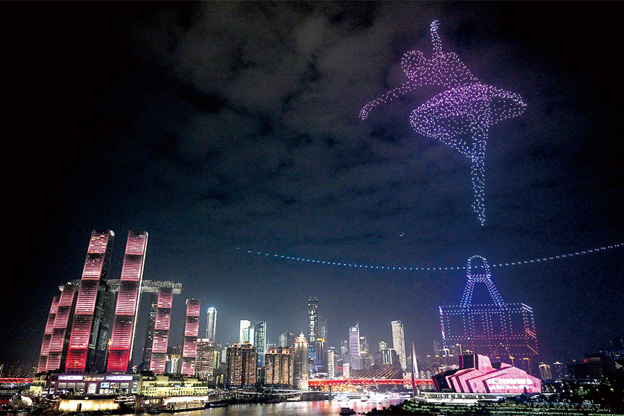 这是10月27日晚在重庆市南岸区南滨路拍摄的世界城市日专场无人机灯光秀表演活动。