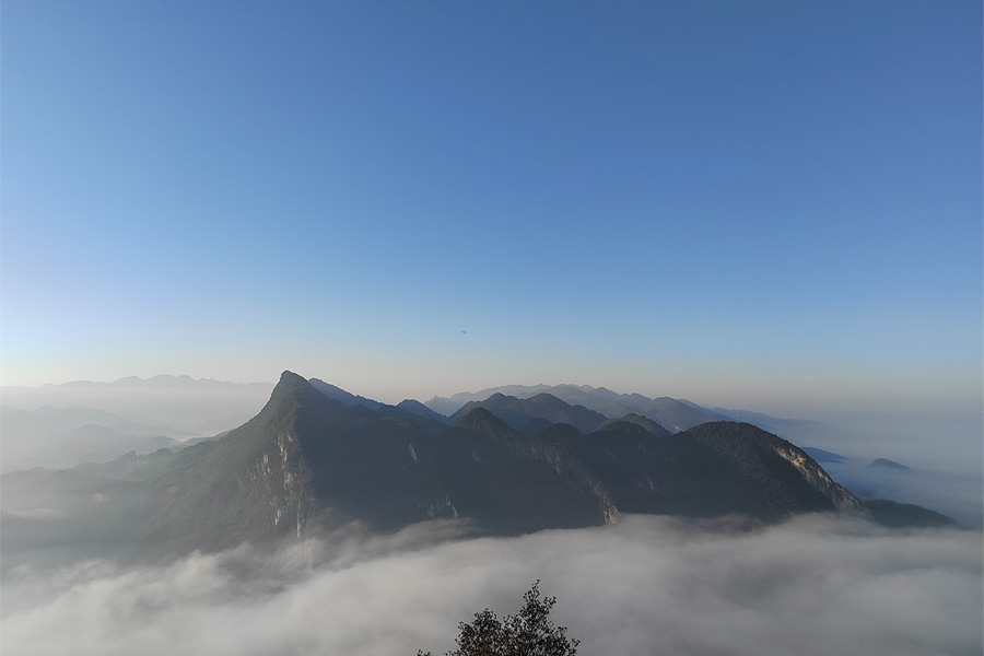 气势恢宏、变幻莫测的云海像一床巨大的棉被把河谷、村寨、田园、森林罩住,给人一个妥妥的阴天感觉,云海之上却是蓝天白云、阳光明媚。
