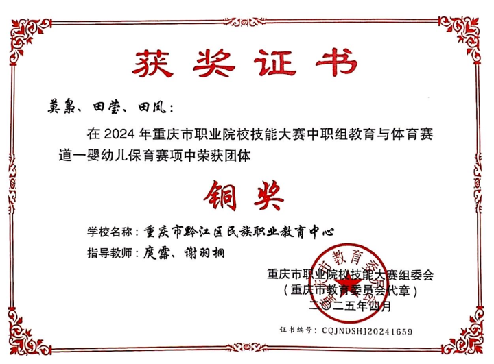 最扎实的是教师的进步。团队成员在教学能力、班主任能力等比赛中斩获13个奖项,包括重庆市班主任能力比赛三等奖。更有15人次将“教学能手”“优秀班主任”等荣誉称号收入囊中。张彩虹老师受邀担任2025年重庆市中职学校教学交流活动评委,姚婷老师被聘为区家庭教育指导员,王晨熹老师则挑起了附属幼儿园园长的重担。