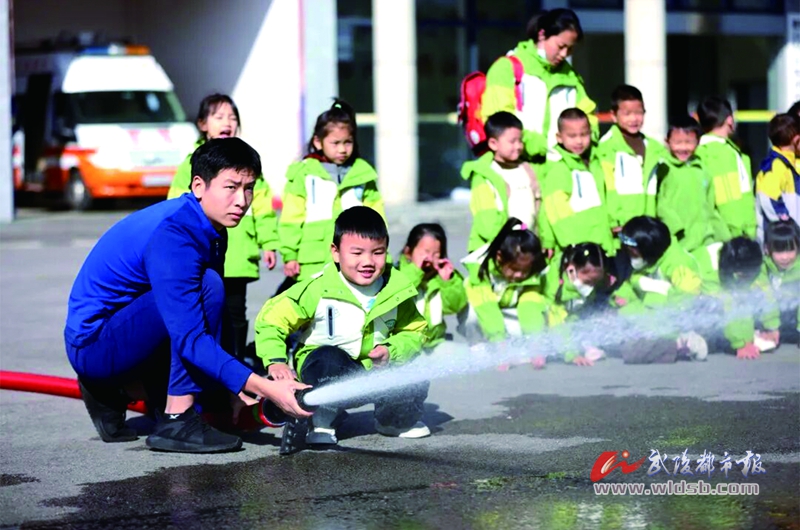 为孩子们展示消防水枪