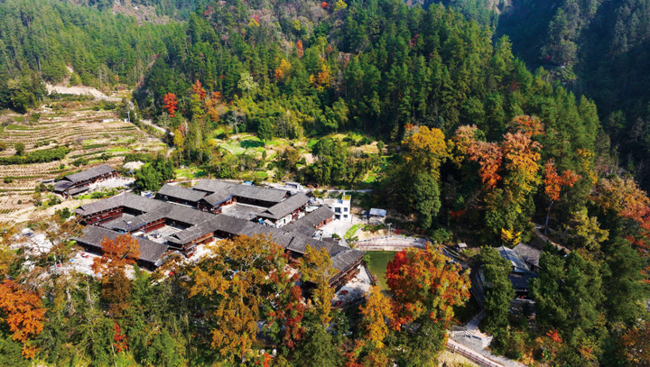 12月5日,枫林掩映着黔江区小南海镇桥梁村古枫寨一角(无人机照片)。古枫寨是一座有着300多年历史的土家族院落,院落四周有100多棵古枫树。寨里至今还保留着土家族传统的生产劳作方式,是中国传统村落和重庆市首批传统村落。初冬时节,古枫寨的枫香、银杏、青冈等树叶五彩斑斓,把古寨掩映成一幅画卷。