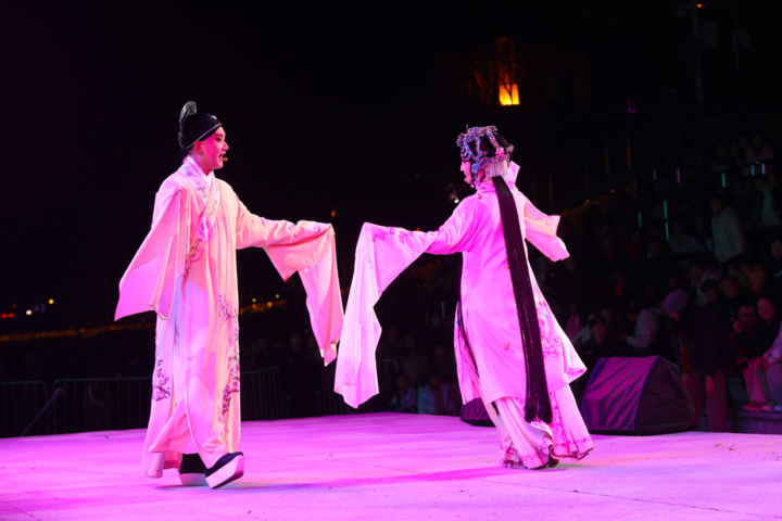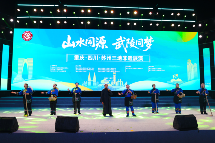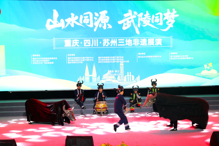 12月19日晚,“山水同源 武陵同梦——重庆·四川·苏州三地非遗展演”活动在重庆市黔江区举行。来自重庆、四川、苏州三地的演职人员展演了10多个国家级、省级非遗项目。江苏苏州评弹《枫桥夜泊》、昆曲《牡丹亭·惊梦》,四川松潘花灯、羌族服饰走秀,重庆秀山花灯、万盛金桥吹打等三地不同特色的非遗汇聚一堂,交相辉映,绽放异彩,为现场观众奉上了一场精彩纷呈的文化艺术视听盛宴。