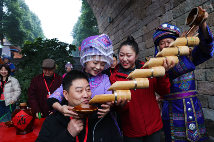 近日,游客在黔江区濯水古镇喝拦门酒。濯水古镇是第六批中国历史文化名镇和国家5A级景区。近年来,黔江区充分利用濯水古镇的自然、人文景观和非遗项目,通过体育+文旅+农旅的模式,为古镇的旅游发展赋能,注入新活力。尽管时值冬日,濯水古镇每天仍有不少游客打卡、观光。(首席记者 杨敏 摄)