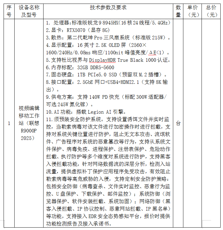 为了保障中心相关工作顺利开展,拟采购一台视频编辑移动工作站,现将具体采购内容公告如下: