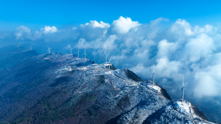 持续多日的雨雪天气,致黔江区海拔1500多米的五福岭出现2026年首场雾凇。千姿百态的玉树琼枝,把五福岭风电场掩映成童话世界,高耸的风力发电机组“大风车”在云雾中不停地旋转,将云端清风“转”成点亮万家灯火的绿色电能。