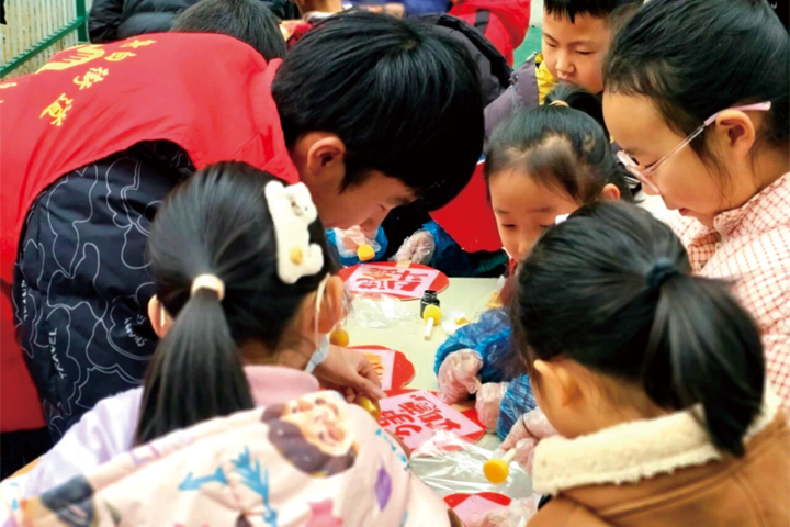 活动还设置了三个各具特色的非遗实践体验区,让小朋友们在动手创作中深度感受传统技艺之美。在“巧手塑形”工坊,小朋友们化身小小匠人,运用彩色黏土模仿并创意制作传统节庆食品和吉祥物造型。在“纹样绘新”工坊,小朋友们运用水彩、贴纸、干花等材料,自由创作蕴含传统纹样或吉祥图案的画作。在“古法拓福”工坊,小朋友们在特制红色底板上刷墨、覆版、匀力拍拓,体验传统拓印技艺。